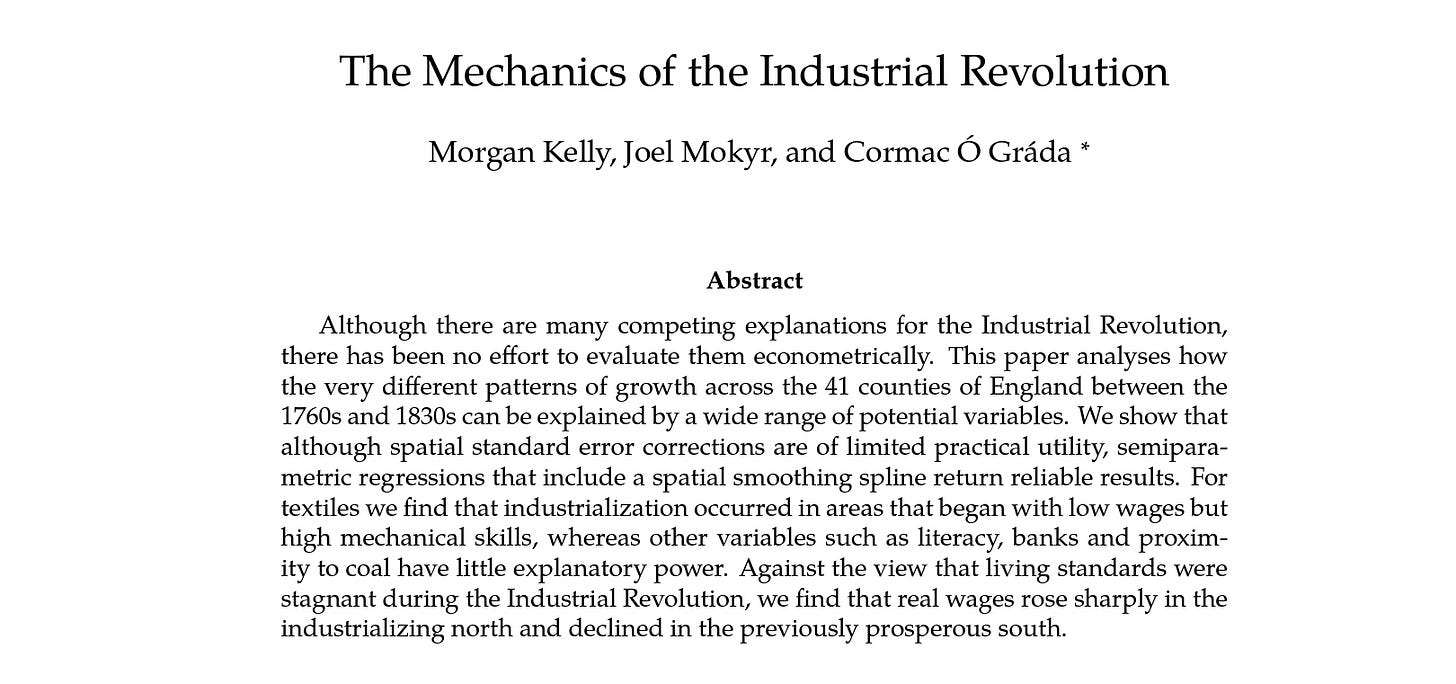 اما این مقاله جدید Journal of Political Economy به اسم «مکانیک های انقلاب صنعتی»، تمام دلایل بالا رو رد می کنه. چجوری؟ میاد تمرکزش رو می ذاره داخل بریتانیا و شروع می کنه به مقایسه بین استانی (به جای مقایسه بین کشوری). ازلحاظ بخشی هم تمرکز می کنه روی صنعت پوشاک که موتر اولیه انقلاب صنعتی بوده. مقاله نشون می ده هیچ رابطه ای بین صنعتی شدن در استان های مختلف بریتانیا و عوامل بالا وجود نداره.